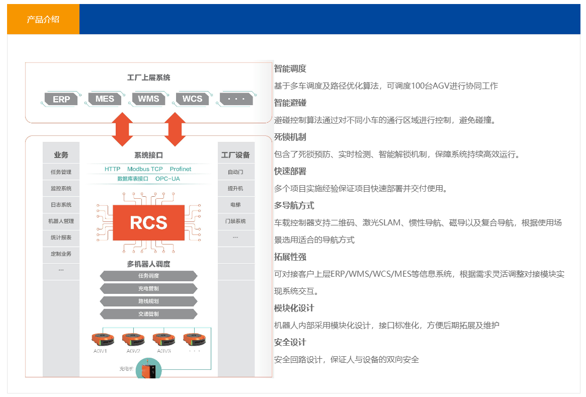 除此之外,蚂蚁机器人的调度系统的特色功能还包括智能调度、智能避碰、死锁机制、快速部署、多导航方式、拓展性强、模块化设计、安全设计。其中,智能调度指的是,基于多车调度及路径优化算法,可调度100台AGV(装备有自动导航装置的运输车)进行协同工作。