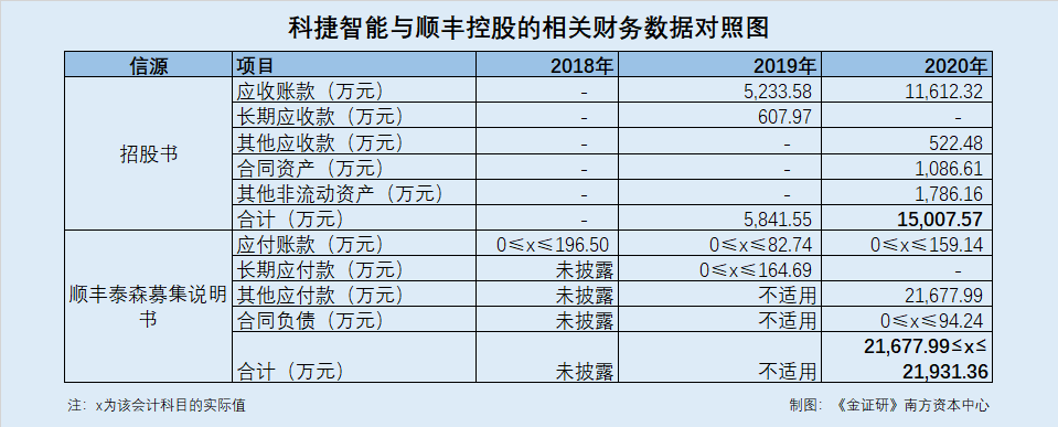 倘若顺丰泰森的其他关联方系科捷智能及其子公司,则经《金证研》南方资本中心测算,2020年,顺丰泰森对科捷智能及其子公司的应付账款、长期应付款、其他应付款、合同负债的合计金额,或至多为21,931.36万元,或至少为21,677.99万元。相比之下,科捷智能对顺丰对应科目的合计值15,007.57万元,差值或介于6,670.42万元与6,923.8万元之间。