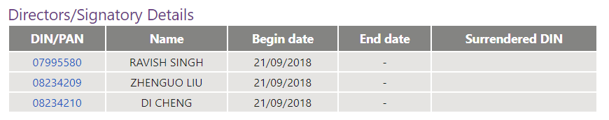 据印度公司事务部公开信息,截至查询日期2022年1月4日,印度科捷共有三名董事,分别为Ravish Singh、Zhenguo Liu、Di Cheng,上任时间为均2018年9月21日。