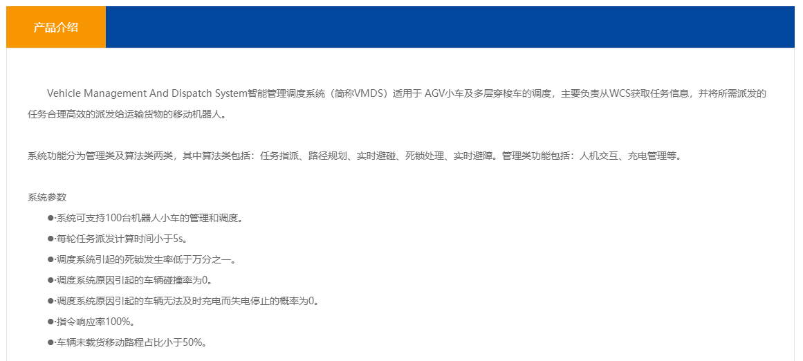 且VMDS调度系统功能分为管理类及算法类。其中,管理类功能包括人机交互、充电管理等;算法类包括任务指派、路径规划、实时避碰、死锁处理、实时避障。并且,VMDS的系统参数中指出,VMDS的系统可支持100台机器人小车的管理和调度。