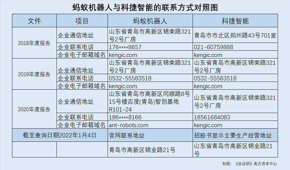 由此可见,截至查询日期2022年1月4日,蚂蚁机器人的联系地址,与科捷智能的住所、生产经营地址、注册地址、办公地址一致。