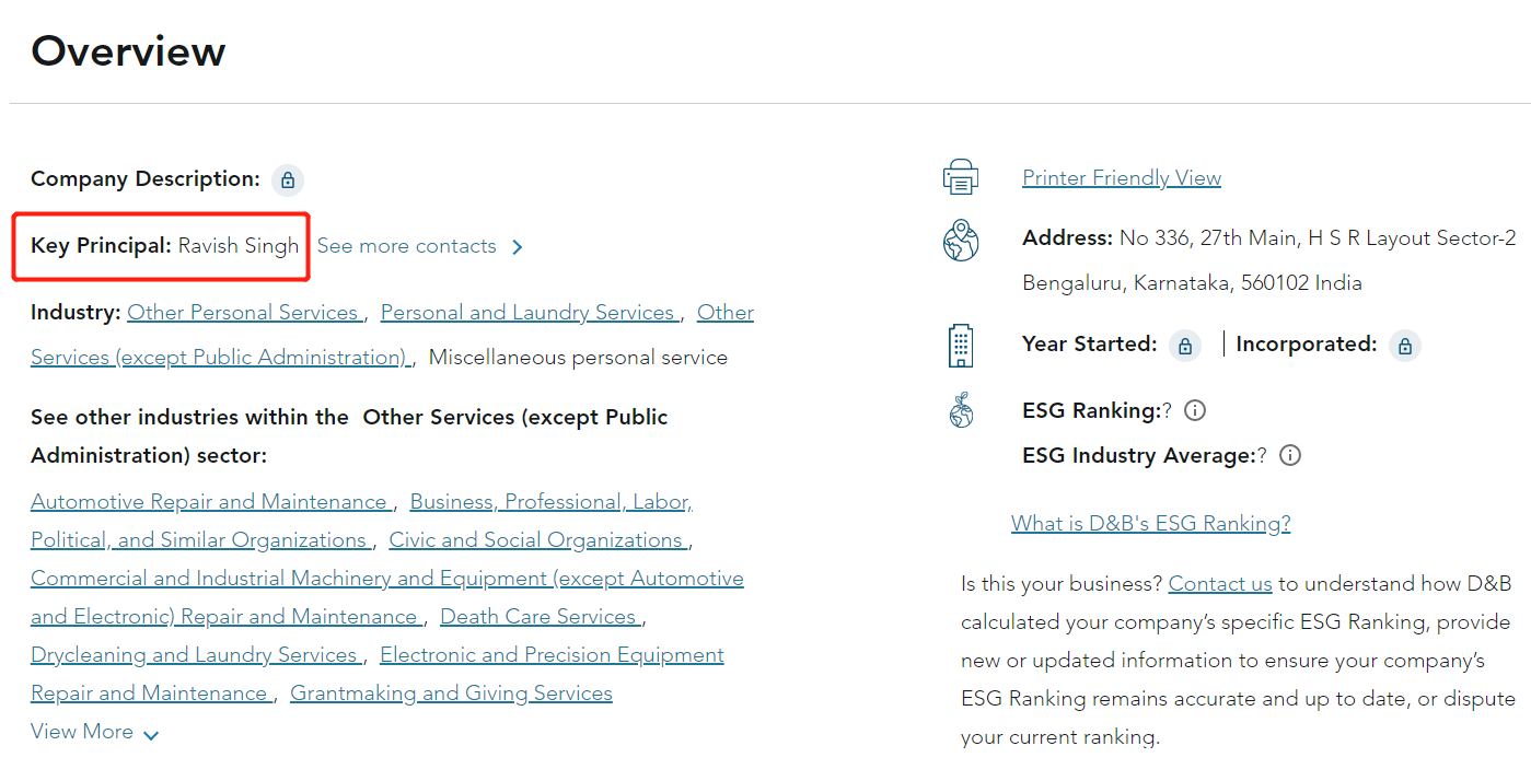 不仅如此,据美国邓白氏公司(DNB)官网,印度科捷的主要负责人(key principal)同样为Ravish Singh。
