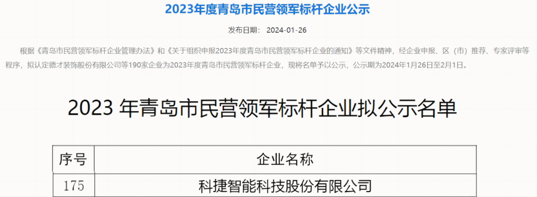 2024年1月26日,青岛市民营经济发展局公示了2023年度青岛市民营领军标杆企业,科捷智能成功入选,这份荣誉,不仅是对科捷智能实力的肯定,更是对其在行业中的引领作用的认可。