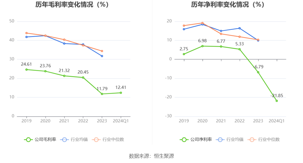 2024年第一季度,公司毛利率为12.41%,同比下降32.18个百分点;净利率为-21.85%,较上年同期上升230.68个百分点。