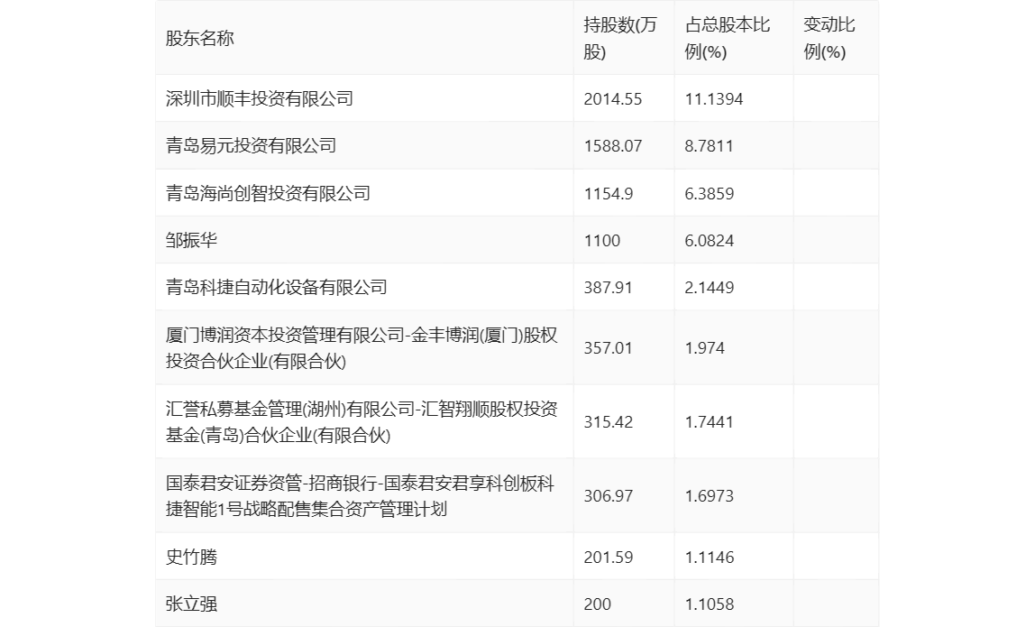 一季报显示,2024年一季度末公司十大流通股东中,持股最多的为深圳市顺丰投资有限公司,占比11.14%。十大流通股东名单相比2023年年报维持不变。在具体持股比例上,青岛科捷自动化设备有限公司、厦门博润资本投资管理有限公司-金丰博润(厦门)股权投资合伙企业(有限合伙)、史竹腾持股有所下降。