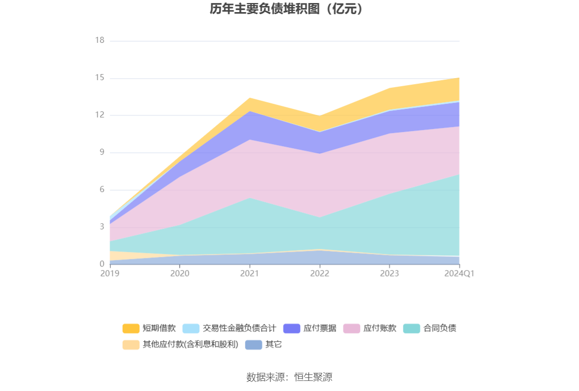 负债重大变化方面,截至2024年一季度末,公司合同负债较上年末增加33.87%,占公司总资产比重上升6.01个百分点;应付账款较上年末减少20.80%,占公司总资产比重下降3.99个百分点;应付职工薪酬较上年末减少36.44%,占公司总资产比重下降0.62个百分点;应付票据较上年末增加8.47%,占公司总资产比重上升0.50个百分点。