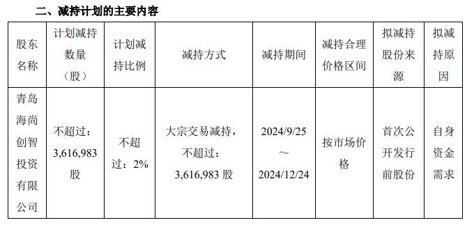科捷智能(688455.SH)近日发布的关于持股5%以上股东减持股份计划的公告显示,公司股东青岛海尚创智投资有限公司(以下简称“海尚创智”)基于自身资金需求,拟通过大宗交易方式,合计减持公司股份不超过总股本的2%,将于公告披露之日起15个交易日后的三个月内进行。