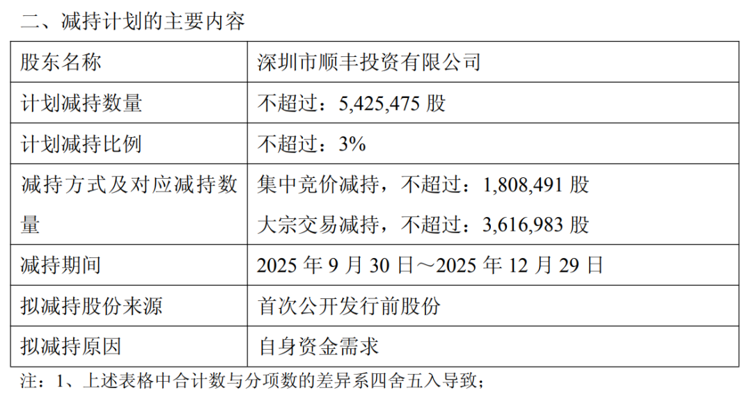 按照减持计划,顺丰投资将于2025年9月30日起的三个月内,通过集中竞价方式减持不超过1%股份,通过大宗交易方式减持不超过2%股份,合计减持不超过公司总股本的3%。