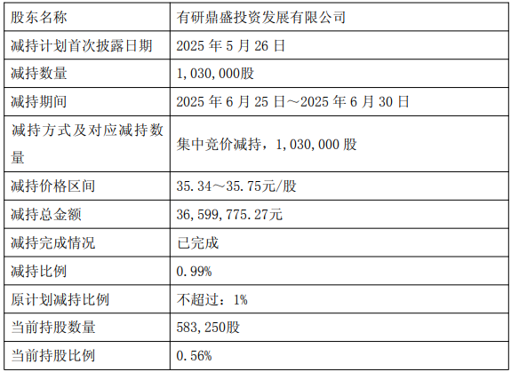 公司于2025年6月30日收到有有研鼎盛投资发展有限公司(以下简称有研鼎盛)出具的《关于股份减持结果的告知函》。有研鼎盛通过集中竞价交易减持其所持有的公司股份合计103万股,占公司总股本的0.99%,公司控股股东未参与本次减持。本次减持计划已实施完毕。有研鼎盛系有研粉材的控股股东中国有研科技集团有限公司(以下简称中国有研)的一致行动人。