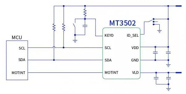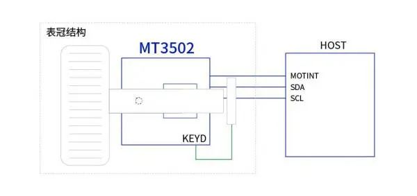 MT3502传感器自带独立按键检测功能,作为数码表冠应用时可支持表冠模块的按键信号输入,减少表冠模块与主控的交互负荷。同时,传感器芯片可选择支持IIC(默认)或SPI接口,灵活对接不同应用场景。其中IIC模块支持最高1MHz的通讯速率,可通过地址选择线或者Swap功能切换芯片的IIC从地址,实现最多4颗MT3502传感器同时挂载同一总线,为用户提供更多创新型组合应用的可能。