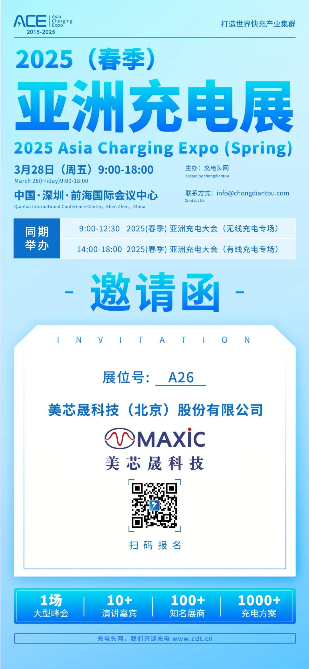 美芯晟科技(北京)股份有限公司参加充电头网主办的2025(春季)亚洲充电展,展位号位于A区A26,3月28日欢迎莅临展会现场交流、洽谈。