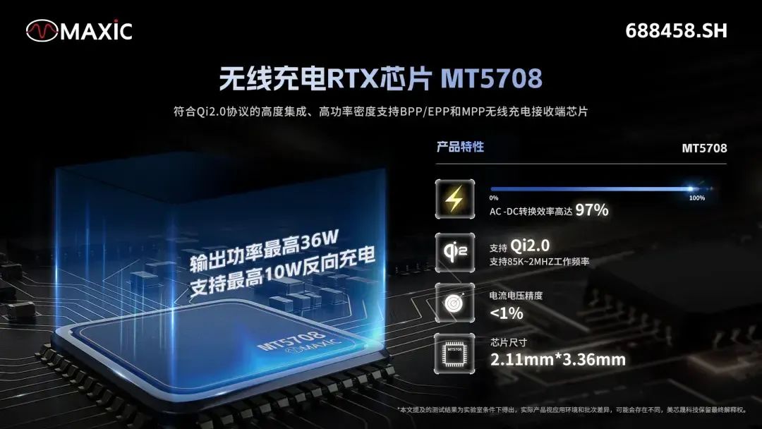美芯晟MT5708是一款符合Qi2.0协议的高度集成、高功率密度,支持BPP/EPP和MPP无线充电的接收端芯片,支持最高36W的无线充电输出以及10W的反向充电功能。