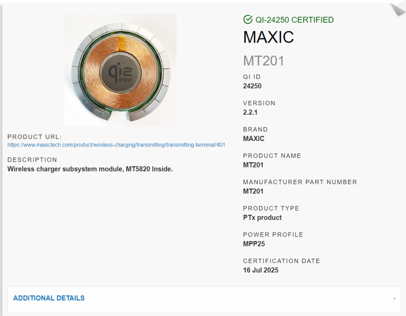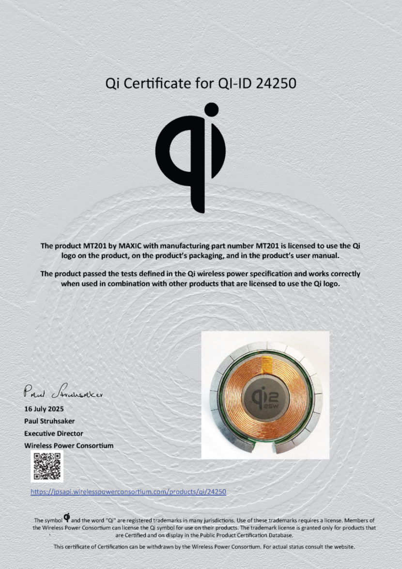 美芯晟自主研发的无线充电发射端模组已通过最新的Qi2.2.1认证,Qi认证ID为24250,料号为MT201,Qi无线充电功率达25W(MPP25),内置美芯晟一芯多充无线充电发射端芯片MT5820,支持BPP、EPP和MPP(5W/15W/25W)三种功率配置。
