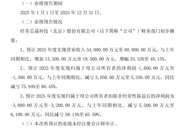 近日,美芯晟(688458)披露2025年度业绩预告。公司预计2025年度实现营业收入54,000.00万元至60,000.00万元,增幅33.33%至48.15%;预计实现归属于母公司所有者的净利润-1,600.00万元至-1,300.00万元,同比减亏75.94%至80.45%。