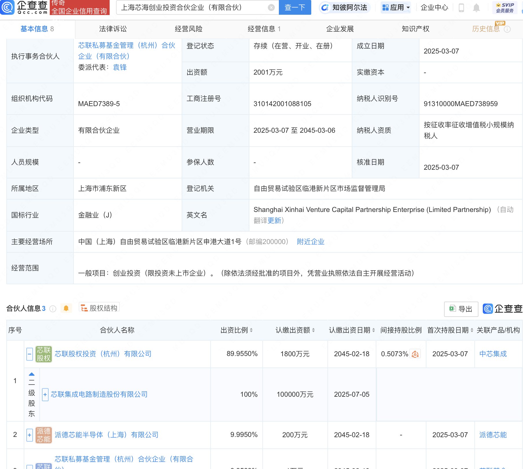 近日,上海芯海创业投资合伙企业(有限合伙)成立,出资额2001万元,经营范围包含:创业投资(限投资未上市企业)。股权穿透显示,该企业由芯联集成(688469)全资子公司芯联股权投资(杭州)有限公司等共同出资。