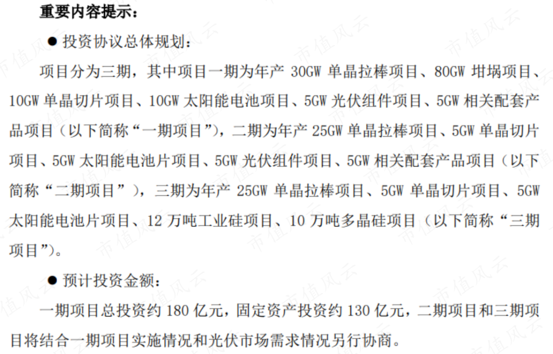 反正项目是一个比一个大,投资也越来越大,其中一期项目拟总投资180亿,3天后公司又公告称将拉棒和坩埚项目分别缩减10GW和40GW,总投资缩减至140亿。