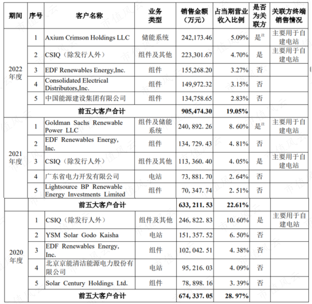 公司组件产品和储能系统都能够直接供应CSIQ的电站开发及运营业务,2020-22年,公司向CSIQ关联电站的销售收入占当期营收比例分别为10.60%、12.65%和9.79%,且均占据第一客户。
