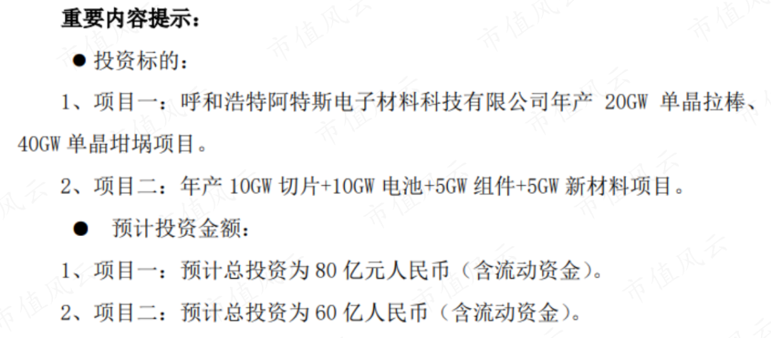 而仅在上市一个月之后,公司就又公告将在呼和浩特投建光伏全产业链大项目,三期合计包括“80GW拉棒-20GW切片-20GW电池片-10GW组件”,以及22万吨硅料、80GW坩埚和5GW配套项目。