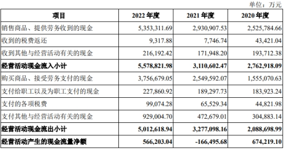 报告期内,公司经营活动产生的现金流量净额分别为674,219.10万元、-166,495.68万元、566,203.04万元;销售商品、提供劳务收到的现金分别为2,525,784.66万元、2,930,907.53万元、5,353,311.69万元。