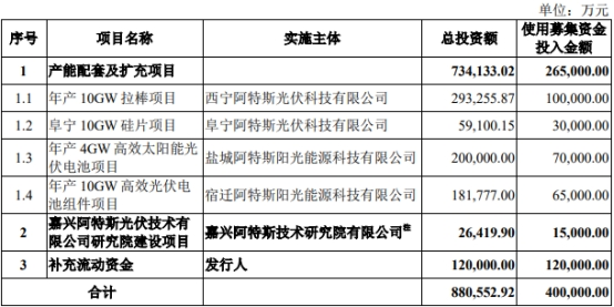 阿特斯最终募集资金净额较原计划多172,782.43万元(行使超额配售选择权之前);262,845.46万元(全额行使超额配售选择权之后)。2023年6月6日,阿特斯披露的招股说明书显示,公司拟募集资金400,000.00万元,分别用于产能配套及扩充项目、嘉兴阿特斯光伏技术有限公司研究院建设项目、补充流动资金。
