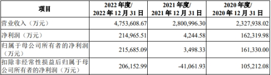2020年至2022年,阿特斯的营业收入分别为2,327,938.02万元、2,800,996.30万元、4,753,608.67万元;净利润分别为162,319.98万元、4,244.58万元、214,965.51万元;归属于母公司所有者的净利润分别为161,330.00万元、3,498.33万元、215,685.09万元;扣除非经常性损益后归属于母公司所有者的净利润分别为105,212.08万元、-41,061.93万元、206,152.99万元。