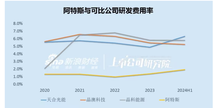 例如,2020年至2024上半年,阿特斯研发支出占营收比例一直徘徊在1%-2%之间,远低于晶澳科技、晶科能源和天合光能。后几家巨头的研发投入每年几乎都在5%以上。