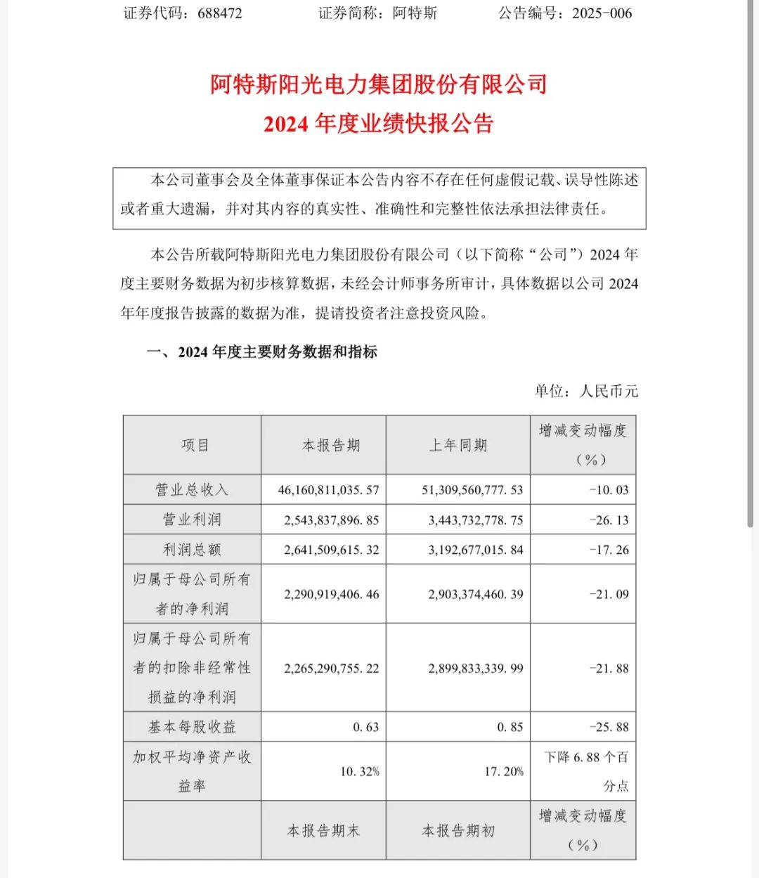 2月27日,阿特斯发布业绩快报。2024年,阿特斯实现营业收入461.61亿元,同比下降10.03%;归母净利润22.91亿元,同比下降21.09%。