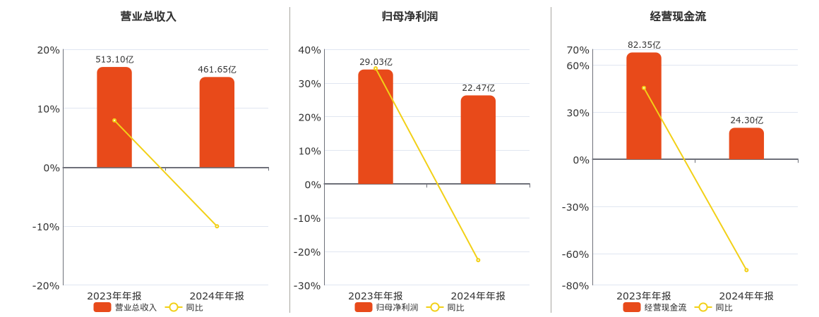 公司营业总收入为461.65亿元,较去年同报告期营业总收入减少51.45亿元,同比较去年同期下降10.03%。归母净利润为22.47亿元,较去年同报告期归母净利润减少6.56亿元,同比较去年同期下降22.60%。经营活动现金净流入为24.30亿元,较去年同报告期经营活动现金净流入减少58.04亿元,同比较去年同期下降70.49%。