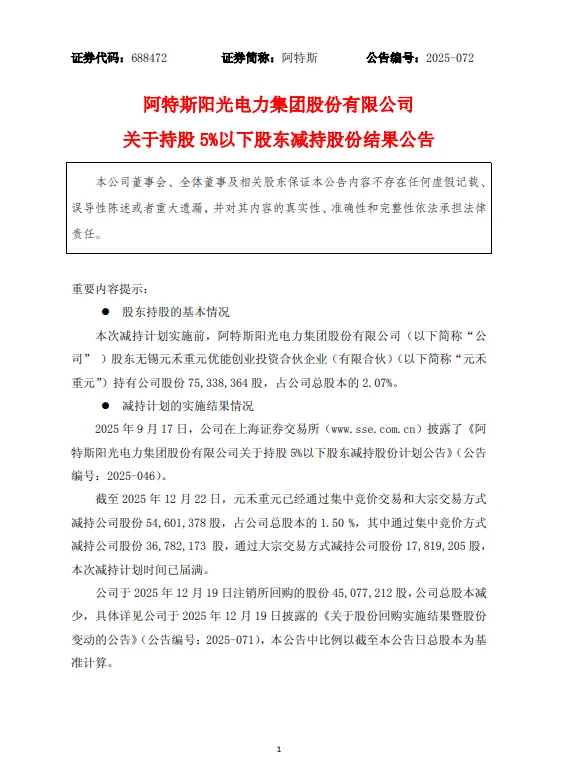 12月22日,阿特斯(688472)发布关于持股5%以下股东减持股份结果公告显示,公司股东无锡元禾重元优能创业投资合伙企业(有限合伙)(简称“元禾重元”)于2025年9月23日~2025年12月22日共减持了54,601,378股,占公司总股本的1.50%,其中通过集中竞价方式减持公司股份36,782,173股,通过大宗交易方式减持公司股份17,819,205股,本次减持计划时间已届满。