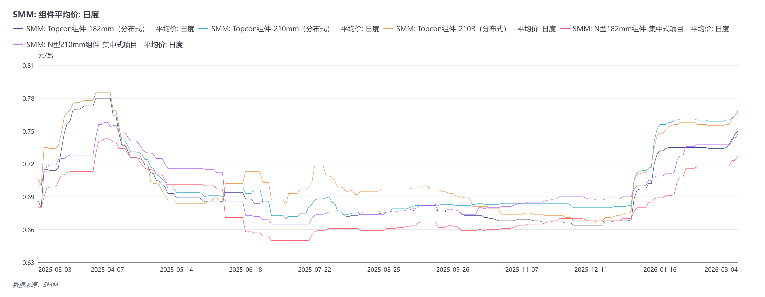 组件价格方面,据SMM现货报价显示,自2025年12月下旬以来,组件价格整体呈现震荡上行的态势,截至2026年3月4日,Topcon组件-182mm(分布式)现货报价已涨至0.74~0.76元/瓦,均价报0.75元/瓦,较2025年12月17日的0.664元/瓦上涨0.086元/瓦,涨幅达12.95%;Topcon组件-210mm(分布式)现货报价涨至0.754~0.781元/瓦,均价报0.768元/瓦,较2025年12月17日的0.68元/瓦上涨0.088元/瓦,涨幅达12.94%;另外,Topcon组件-210R(分布式)、N型182mm组件-集中式项目、N型210mm组件-集中式项目组件等价格也均录得不同程度的上涨。