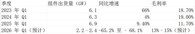 最新业绩预告显示,2026年一季度,该公司确认收入的组件出货量仅2.2-2.4GW,同比暴跌或68%,直接创下2023年以来最差单季表现。