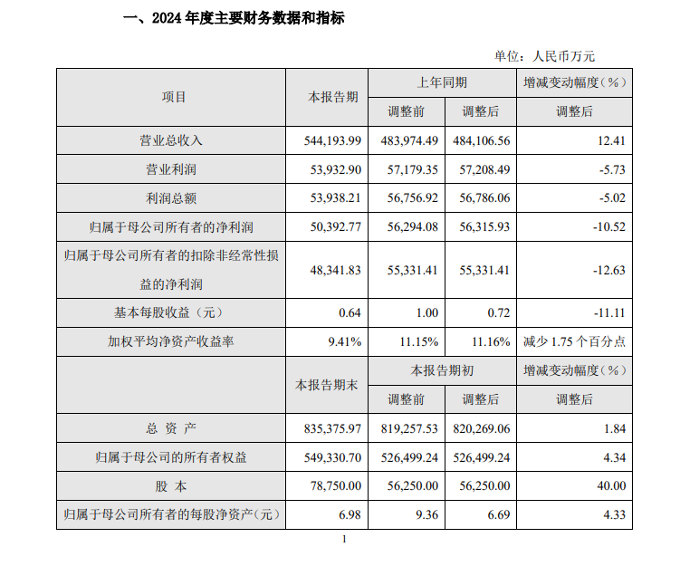 2024年度,萤石网络实现营业总收入54.42亿元,同比增长12.41%;实现利润总额5.39亿元,同比下降5.02%;实现归属于母公司所有者的净利润5.04亿元,同比下降10.52%;实现归属于母公司所有者的扣除非经常性损益的净利润4.83亿元,同比下降12.63%。