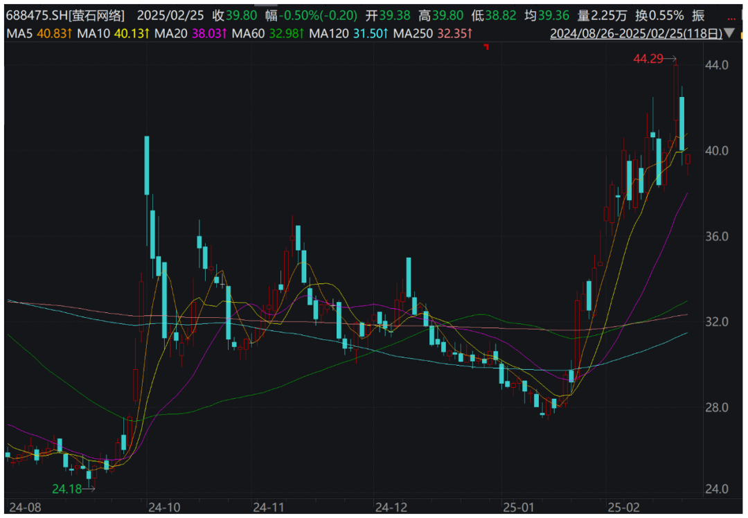在二级市场,萤石网络24日股价低开,当日收盘于40元/股,大跌9.05%。25日,萤石网络再度低开,目前市盈率约为62倍。