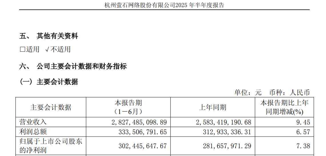 但是也有例外,8月2日,萤石网络(688745.SH)发布《2025年半年度报告》。2025年上半年,萤石网络实现营业收入约28.27亿元,较上年同期增长9.45%;实现归属于上市公司股东的净利润约3.02亿元,较上年同期增长7.38%。