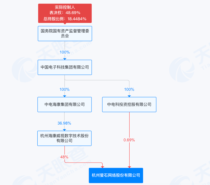 目前萤石网络的大股东为国资“杭州海康威视数字技术股份有限公司”,持股比例为48%,实际控制人为国资委,最终持股比例为18.4484%。