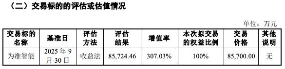 本次交易标的的评估采用收益法,为准智能股东全部权益评估值为 85,724.46万元,较合并报表归属于母公司所有者权益增值64,663.59万元,增值率307.03%。