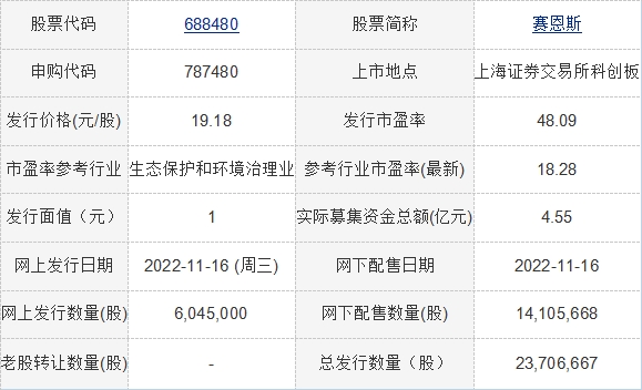 2022年11月15日,赛恩斯发布首次公开发行股票并在科创板上市发行公告指出,公司本次募投项目预计使用募集资金金额为25,000.00万元。按本次发行价格19.18元/股和23,706,667股的新股发行数量计算,若本次发行成功,预计公司募集资金总额45,469.39万元,扣除约5,544.91万元(不含税)的发行费用后,预计募集资金净额39,924.48万元(如有尾数差异,为四舍五入所致)。