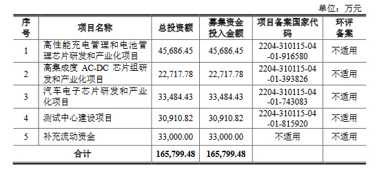 此次IPO,南芯科技将募资16.58亿元用于“高性能充电管理和电池管理芯片研发和产业化项目”、“高集成度AC-DC芯片组研发和产业化项目”、“汽车电子芯片研发和产业化项目”、“测试中心建设项目”以及“补充流动资金”。