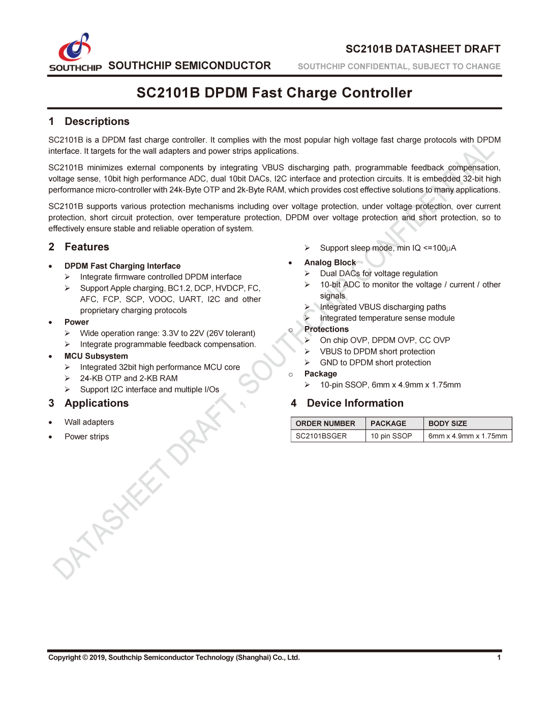 SC2101B 是一款 DPDM 快速充电控制器,采用 DPDM 接口,符合目前最流行的高压快充协议。