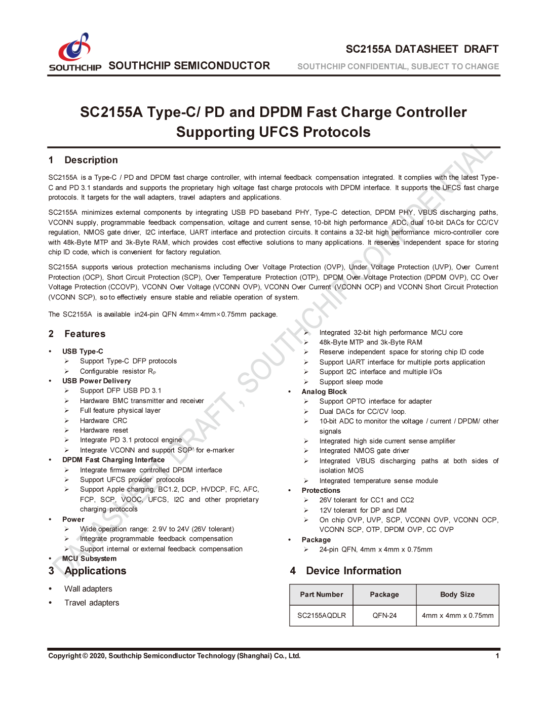SC2155A 是一款 Type-C / PD 和 DPDM 快速充电控制器,集成了内部反馈补偿。符合最新的 TypeC 和 PD 3.1 标准,并支持专有的高压快充协议与 DPDM 接口。支持 UFCS 快充协议。