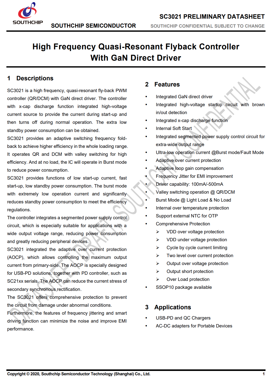 芯片集成分段式供电模式,单绕组供电,无需复杂的供电电路。内置高压启动及交流输入Brown In/Out功能,集成了X-cap放电功能。SC3021C最高支持170KHz工作频率,适用于绕线式变压器。