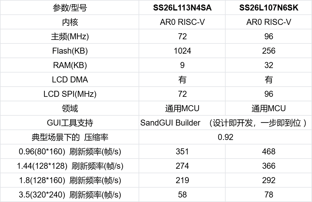 具体参数如上表所示。SS26L1X系列有 SS26L113N4SA、SS26L107N6SK两款芯片,均对驱动数显屏幕做了优化,均搭载了32位高性能RISC-V内核。与传统MCU仅依靠通用SPI接口模拟驱屏不同,SSW芯片内置了专为显示优化的LCDC 显示硬件接口。