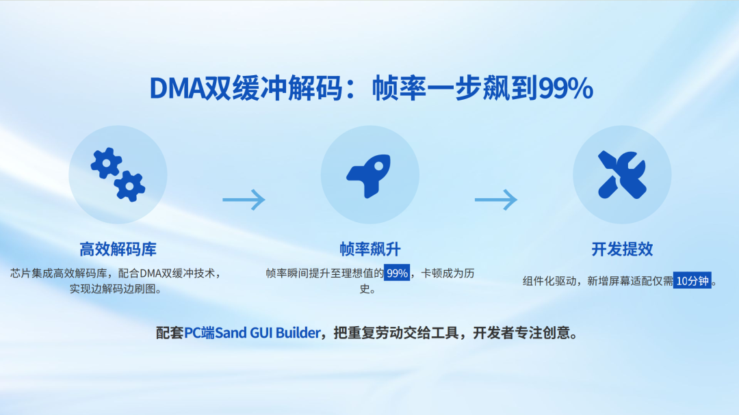 同时内置面向连续刷屏的架构,结合 DMA 机制,可在尽量不占用 CPU 资源的前提下实现屏幕内容的低延迟、无缝刷新,保障动画与交互的流畅度并释放系统算力用于其他关键任务。同时,LCDC 在提供更高带宽的同时由硬件确保时序精准,从源头减少闪屏、撕裂等显示异常风险。