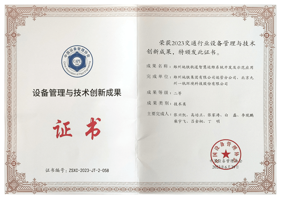 据悉,郑州地铁集团有限公司联合北京九州一轨环境科技股份有限公司(688485)实施的轨道智慧运维系统开发及示范应用项目,于6月29日顺利完成并通过专家会评审,并正式在郑州地铁全线网实施应用。据介绍,该系统是郑州地铁在智慧地铁建设中取得的重要技术成果,系统的应用可有效提高轨道运维管理效率和设备安全水平。且值得一提的是,该项目相关技术成果已荣获中国设备管理协会“2023交通行业设备管理与技术创新成果”二等奖。