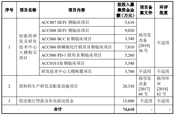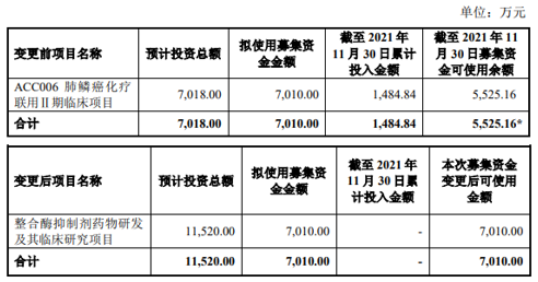 但在今年8月27日,公司便将3项抗肿瘤相关募投项目进行了变更。其中ACC006 BCC II 期临床项目、ACC006 PD-1联用II期临床项目、ACC010 I/II 期临床项目部分未使用募集资金,分别被用于新项目“艾邦德?III 期临床及上市后研究项目、乌司他丁新适应症研究项目。