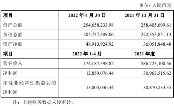 截至2021年12月31日及2022年4月30日,南大药业资产总额分别为2.58亿元、2.55亿元,负债总额分别为2.22亿元、2.06亿元,资产净额分别为3605.18万元、4891.09万元;南大药业2021年、2022年1-4月营业收入分别为5.87亿元、1.74亿元,净利润分别为3096.35万元、1285.91万元,扣除非经常性损益后的净利润分别为3087.02万元、1300.40万元。