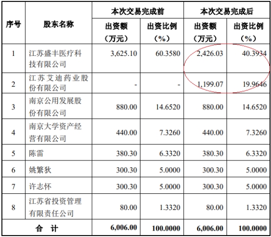 上述交易完成后,盛丰医疗对南大药业的出资额为2,426.03万元,出资比例为40.3934%;艾迪药业出资额为1,199.07万元,出资比例为19.9646%。