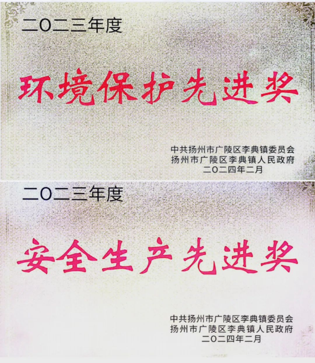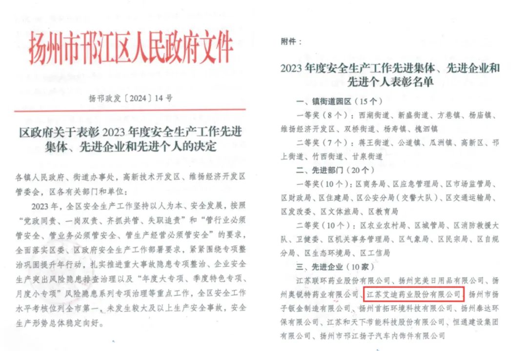 同时,子公司扬州艾迪制药有限公司也于近日获得扬州市广陵区李典镇委员会及扬州市广陵区李典镇人民政府颁发的“2023年度环境保护先进奖”、“2023年度安全生产先进奖”。