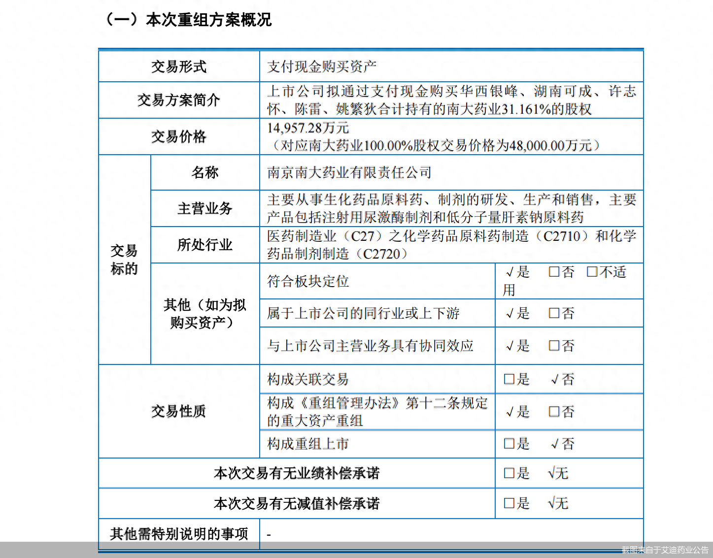 据艾迪药业6月26日公告,公司拟通过支付现金购买华西银峰、湖南可成、许志怀、陈雷、姚繁狄合计持有的南大药业31.161%的股权,交易价格约1.5亿元。本次交易完成后,艾迪药业将直接持有南大药业51.1256%的股权,实现对南大药业的控股。