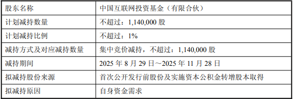 三未信安(688489.SH)昨日晚间发布股东减持股份计划公告。自本减持计划公告披露之日起的15个交易日后的3个月内,中国互联网投资基金(有限合伙)(以下简称“中网投”)拟采用集中竞价方式减持不超过114.00万股,即不超过公司总股本的1%。